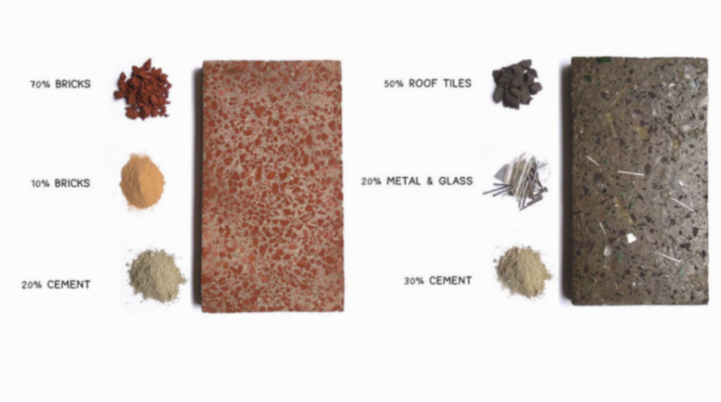 After numerous experiments using waste building materials and binders collected from demolitions, Hakkens discovered that he could recycle a large portion of construction debris and, by mixing it with 20–30% new cement, produce bricks capable of lasting up to 100 years. He also powders certain materials such as black roof tiles or red bricks to create pigments for coloring his products.