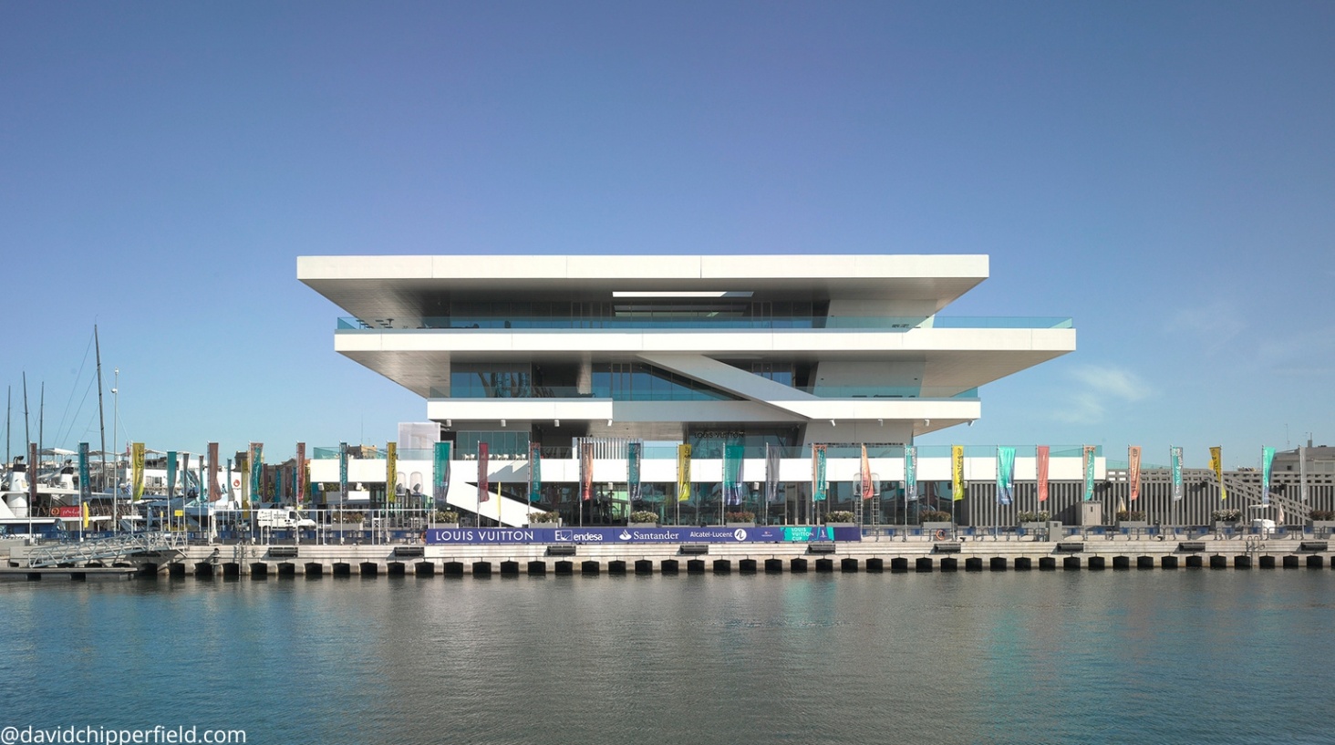 Chipperfield’ın dikkat çekici bir diğer projesi ise, İspanya Valensiya'da 150 yılı aşkın süredir ilk kez Avrupa'da düzenlenen offshore yarışmasının odağı haline gelen yapıdır. America's Cup için tasarlanacak yapı için 2006 yılında düzenlenen yarışmayı kazanan Chipperfield, takımların merkezi üssü olarak hizmet verecek ve aynı zamanda halkın yarışı da görebileceği projenin tasarımını böylece üstlendi. Dört kattan oluşan betonarme binanın halka açık seyirci platformu, bütün kanala hakimdir. Üst üste dizilen bembeyaz yatay düzlemler arasında yer alan şeffaf cephe sayesinde, tüm yapı boyunca kesintisiz bir deniz manzarası izlenebilir. Binanın zemin katında VIP alanları ve restoranlar vardır. Binada sadece birkaç malzeme kullanılmıştır. Beyaz boyalı çelik kaplama, beton yapının sınırlarını belirginleştirirken; tavan, lineer sıva altı aydınlatma sistemlerini barındıran beyaz metal panellerle kaplıdır. Dış mekanlarda zeminler masif ahşap ile kaplanırken, iç mekanda beyaz renk epoksi tercih edilmiştir. Basit, parlak renklerdeki mobilyalar yapının baskın beyazlığını dengeler ve bina içindeki farklı bölgeleri ayrıştırır. Bu sadelik içindeki güçlü bağlam, yapıya denizden bakıldığında yaşayan bir heykel gibi görünümü kazandırır.